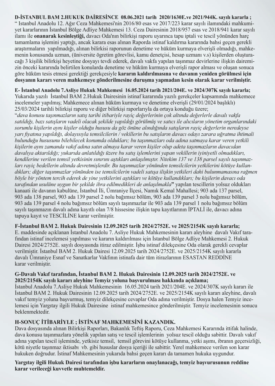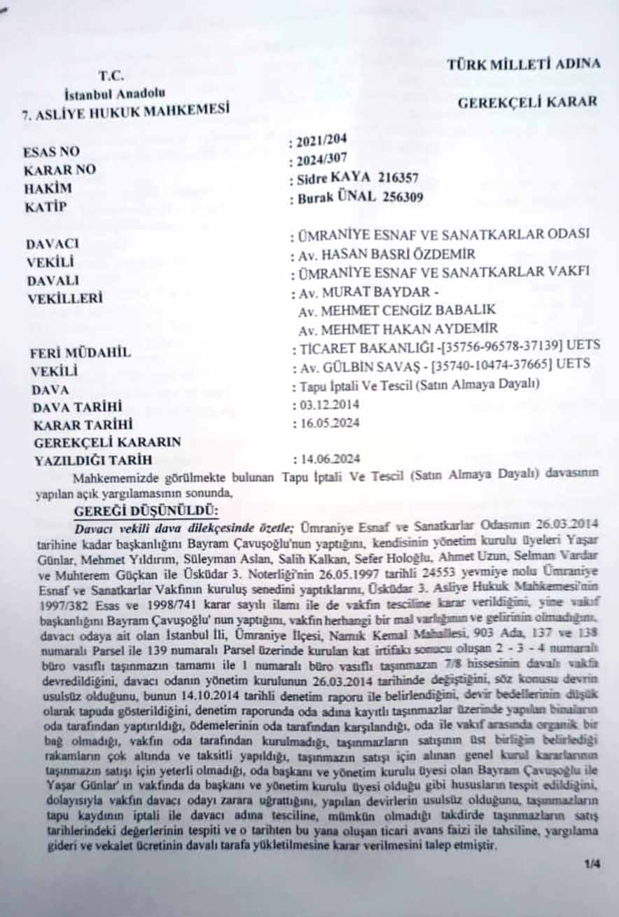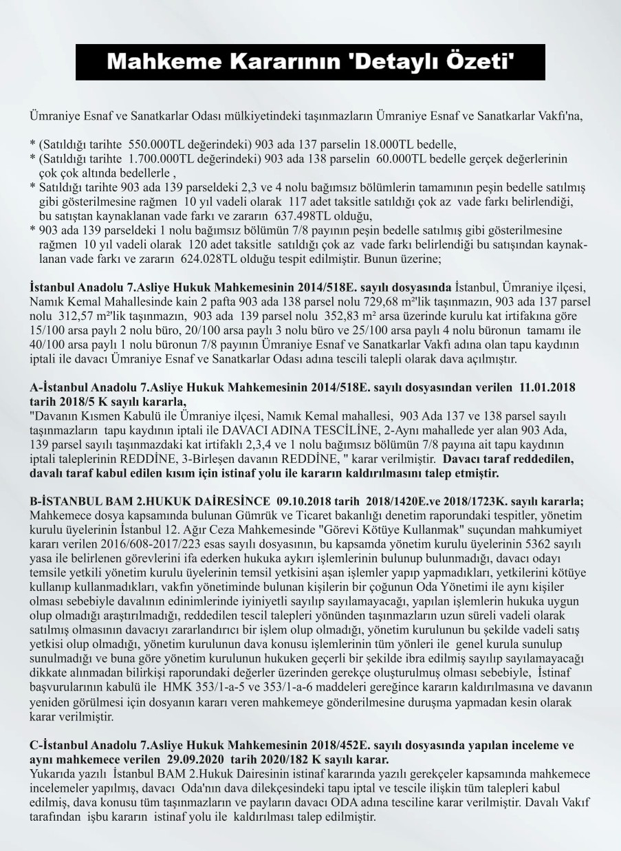 .Ümraniye Esnaf ve Sanatkarlar Odası Başkanı açıklamalarına şu sözlerle devam etti. “Yaklaşık 11 yıl süren hukuk mücadelesinde dava dosyası 3 kez yerel mahkeme ve 3 kez istinaf mahkemesi tarafından incelendi. Yargılama süreci sonunda vakıf tarafından yapılan tüm itirazlar reddedilirken, taşınmazların devrinin yolsuz tescil niteliğinde olduğu mahkeme kararlarıyla sabit hale geldi.