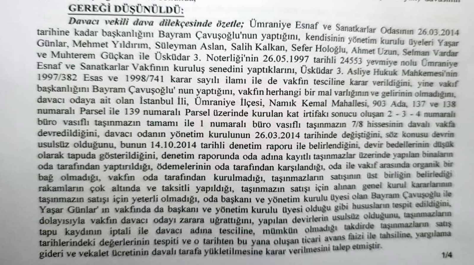 35.000 esnafımızın aidat ödediği ve 5300 üyesi olan Esnaf ve Sanatkarlar odasının mülklerini kendi vakıflarına usulsüzce adeta gasp edercesine devir edenler hukuk karşısında yargılandılar ayrıca Bakanlığımızın açtığı davada da ceza aldılar,hak mahrumiyeti aldılar. İstinaf ve Yargıtay tarafından onaylanarak karar netleşti. Bizler göreve gelir gelmez Tapu İptal davası açtık ve Bakanlığımızdan talepte bulunduk bizi inceleyin denetleyin talebinde bulunduk.ve yolsuzlukların var olduğu yönünde dilekçeli müracaatımız oldu.