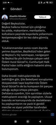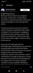 “Beykoz halkına hizmet için çıktığımız bu yolda, makamların, menfaatlerin, koltukların peşinde koşanlarla yollarımızın kesişemeyeceğini bir kez daha görmüş olduk. Tutuklanmamdan sonra rızam dışında yerime dayatılan, Beylikdüzü’nden gelen ve Beykoz’u hiç tanımayan, navigasyon ile Beykoz’da yön bulmaya çalışan vekil Özlem Vural Gürzel’in, Cumhuriyet Halk Partisi’nden istifa ettiğinin haberini almış bulunuyorum. Daha önceki mektuplarımda da belirttiğim gibi, Şile Belediyesi soruşturma dosyasındaki tape kayıtlarında Özlem Vural Gürzel’in de bu kumpasın bir parçası olduğu açıkça ortaya çıkmıştır” diyen tutuklu Beykoz Belediye Başkanı Alaattin Köseler ’in Şile Belediyesi soruşturma dosyası ile ilgili sözleri dikkat çekti.