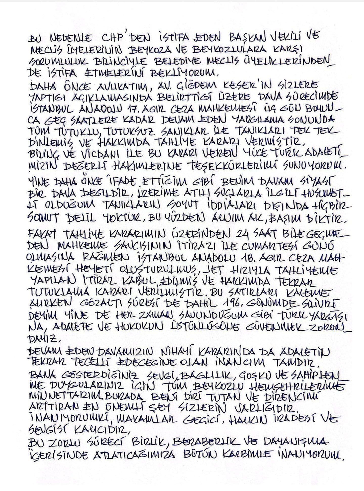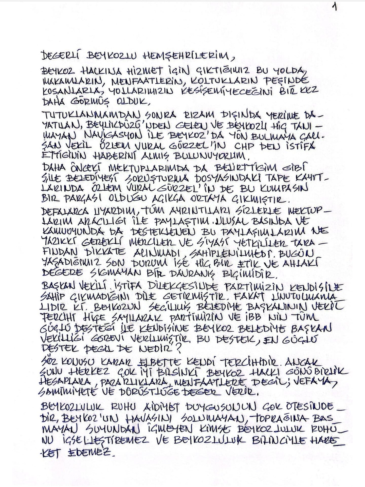 “Beykoz halkına hizmet için çıktığımız bu yolda, makamların, menfaatlerin, koltukların peşinde koşanlarla yollarımızın kesişemeyeceğini bir kez daha görmüş olduk. Tutuklanmamdan sonra rızam dışında yerime dayatılan, Beylikdüzü’nden gelen ve Beykoz’u hiç tanımayan, navigasyon ile Beykoz’da yön bulmaya çalışan vekil Özlem Vural Gürzel’in, Cumhuriyet Halk Partisi’nden istifa ettiğinin haberini almış bulunuyorum. Daha önceki mektuplarımda da belirttiğim gibi, Şile Belediyesi soruşturma dosyasındaki tape kayıtlarında Özlem Vural Gürzel’in de bu kumpasın bir parçası olduğu açıkça ortaya çıkmıştır” diyen tutuklu Beykoz Belediye Başkanı Alaattin Köseler ’in Şile Belediyesi soruşturma dosyası ile ilgili sözleri dikkat çekti.