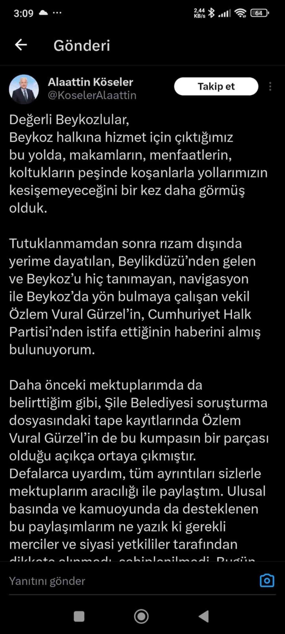 CHP’li belediyelere yönelik operasyonlarda tutuklanıp görevden alınan Beykoz Belediye Başkanı Alaattin Köseler’in yerine Belediye Meclis’i tarafından Beykoz Belediyesi Başkan Vekili seçilen Özlem Vural Gürzel partisinden istifa etmişti.