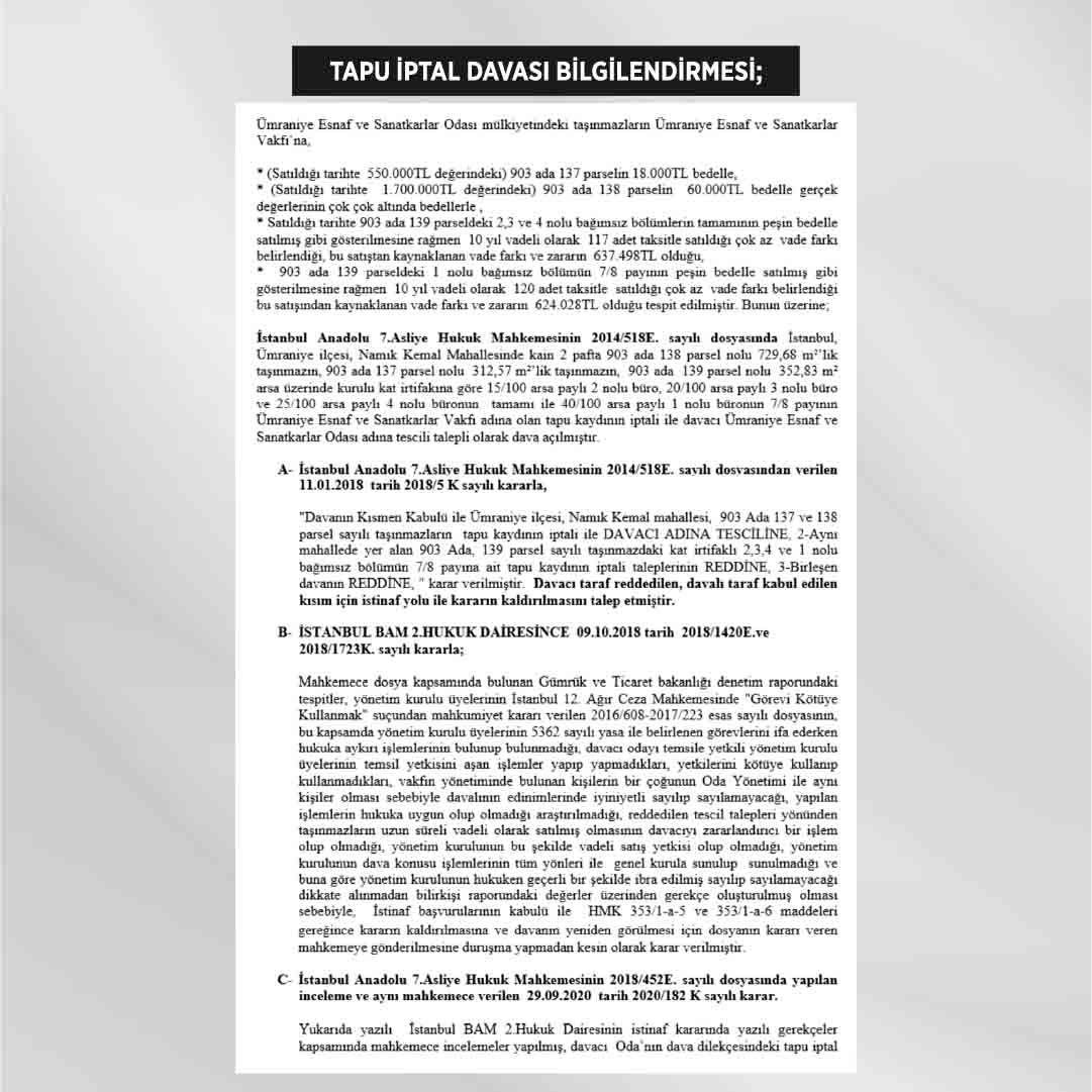 Kamuoyunda uzun süredir merak edilen davanın geçmişi 2014 yılına dayanıyor. Ümraniye Esnaf ve Sanatkarlar Odası, kendi mülkiyetindeki bazı taşınmazların gerçek değerlerinin çok altında fiyatlarla Ümraniye Esnaf ve Sanatkarlar Vakfı’na devredildiğini tespit ederek, hukuki süreç başlatmış.